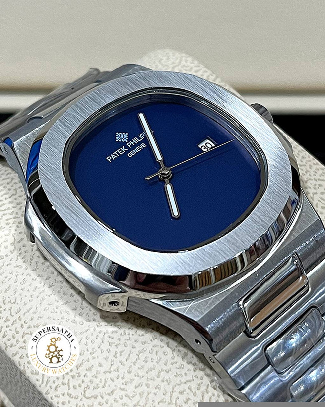 صفحه مربعی سورمه ای ، با قاب نقرهای 43 میلیمتری، اون حس قدرت و نجابت کلاسیک ناتیلوس رو منتقل میکنه. ضخامت 11.3 میلیمتری و وزن 143 گرمی، تعادل مناسب بین راحتی و استحکام رو ایجاد کرده.