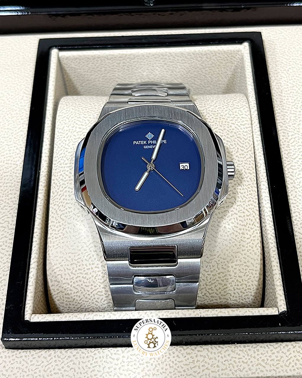 صفحه مربعی سورمه ای ، با قاب نقرهای 43 میلیمتری، اون حس قدرت و نجابت کلاسیک ناتیلوس رو منتقل میکنه. ضخامت 11.3 میلیمتری و وزن 143 گرمی، تعادل مناسب بین راحتی و استحکام رو ایجاد کرده.