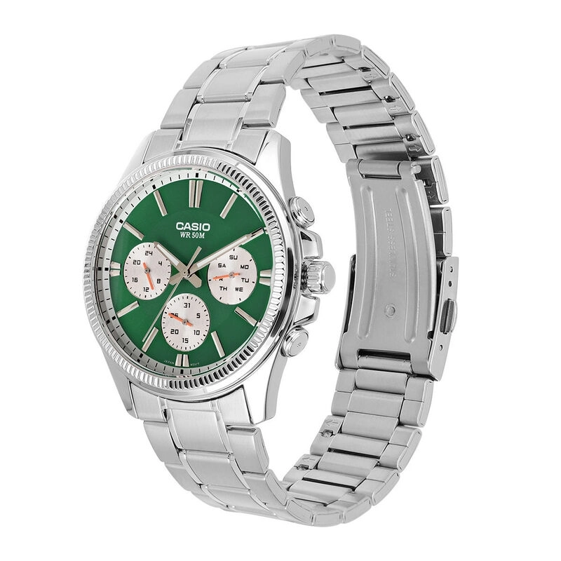 ساعت مچی مردانه کاسیو مدل CASIO MTP-1375D-3AVDF این ساعت آنالوگ استیل کلاسیک با طراحی برجسته و پیچیدگی، با صفحهای در رنگهای جذاب تزئین شده است. دایلهای داخلی آن شامل نمایش روز، تاریخ و ساعت 24 ساعته هستند. مقاومت در برابر آب تا عمق 50 متر این امکان را میدهد که بدون نگرانی از آن استفاده کنید، حتی در روزهای بارانی.