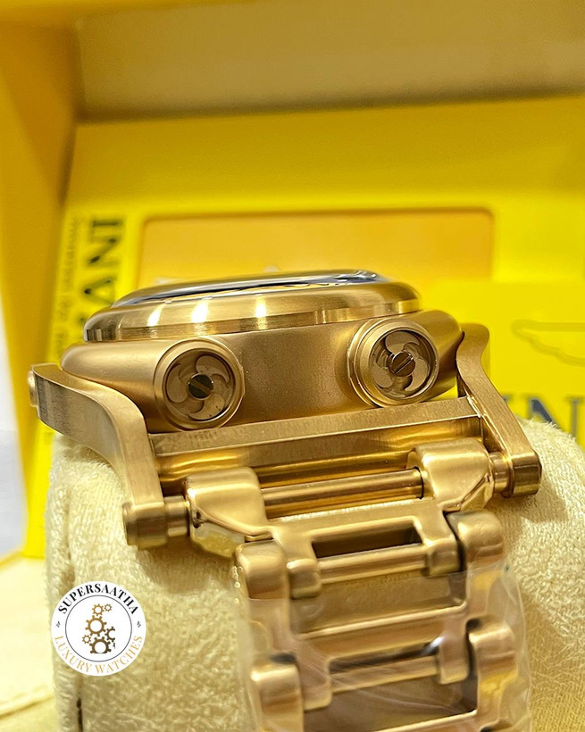 این ساعت مردانه اینویکتا Invicta Sea Hunter با طراحی کرنوگراف با صفحه مشکی و بدنه طلایی، یه ترکیب رنگ چشمگیره که از استایل راحت و روزمره تا رسمی و مجلسی، بهخوبی خودشو نشون میده و تو هر تیپی میدرخشه. سه موتور کوارتز ژاپنی براش کار زمانسنجی، نمایش تاریخ و عملکرد عقربه ثانیه رو انجام میدن. عقربههای شبنما هم کاربرد دارن .